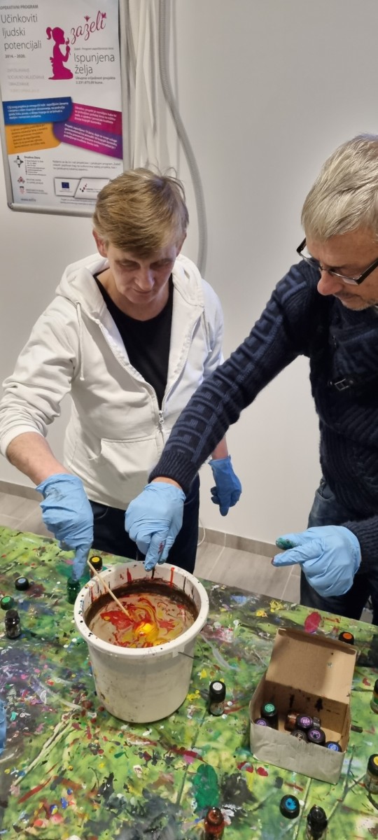 Odradili smo i praktičnu nastavu u Sisku. Ugostila nas je udruga "Društvo DORO" iz Siska. Članovima udruge, polaznici sisačke ekipe antistresnih kreativnih radionica pokazivali su dvije zanimljive tehnike koje su naučili proteklih skoro godinu dana. Izrađivali smo slike tehnikom izlijevanja akrilnih boja. Potom su polaznici pokazali kako se mramorira, odnosno posebnom tehnikom bojanja bojaju razni predmeti. Ovoga puta bojali smo kuglice od stiropora.