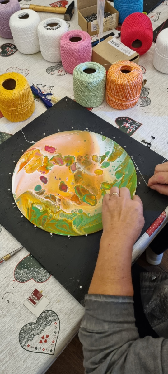 S nama je uvijek bolje 🙂 Na današnjoj četvrtoj radionici s članovima udruge umirovljenika Novi Zagreb izrađivali smo okvire za slike rađene tehnikom izlijevanja akrilnih boja. Okviri su se radili tehnikom string art.