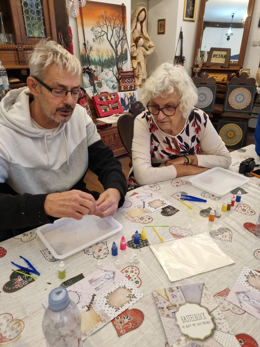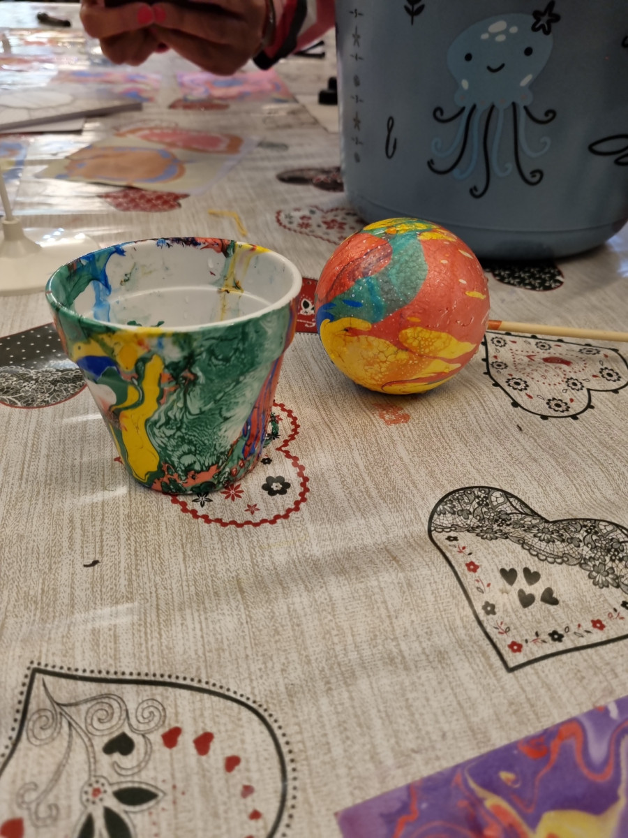 Na današnjoj antistresnoj kreativnoj radionici "S NAMA JE BOLJE" koja se održala u Hrvatskoj kući "Materina priča" a na kojoj su sudjelovali članovi Udruge umirovljenika Novi Zagreb, podružnica Seniori Studentskog Grada, naučili smo slikanje tehnikom mramoriranja ili tzv. marbling.