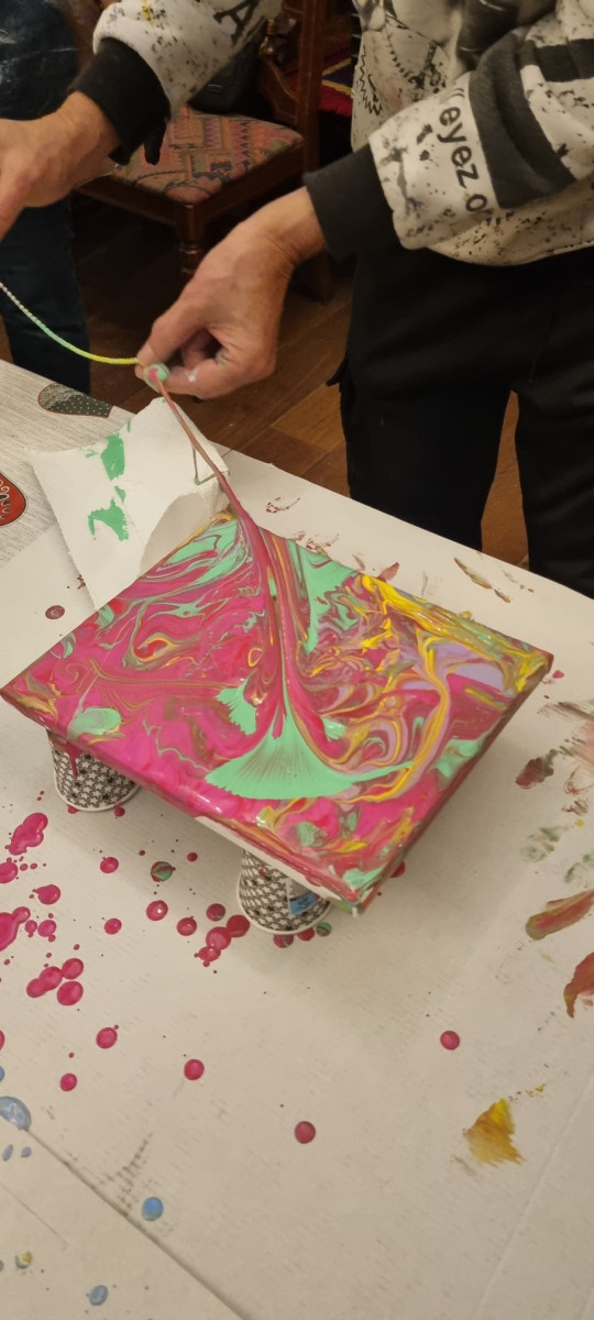Danas smo u Hrvatskoj kući ugostili članice udruge žena oboljelih od malignih bolesti „Nismo same“. Na prvoj radionici obradili smo tehniku izlijevanja akrilnih boja. Nakon pripreme i zaštite radnog mjesta pokazali smo kako se pripremaju boje. Potom smo objasnili dva načina na koja smo radili, to su flip cup i open cup. Polaznice su vlastitim odabirom boja i načinom krenule sa stvaranjem pravih umjetničkih djela.